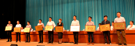 表彰会上,陈胜峰市长宣读了表彰文件,华峰集团有限公司荣获2014年度瑞安市工业50强企业第一名,浙江华峰氨纶股份有限公司、浙江华峰新材料股份有限公司和浙江华峰合成树脂有限公司在2014年度瑞安市缴纳税费50强工业企业中,分别位列第一、第二和第七名,瑞安市远东化工有限公司位列2014年度瑞安市商贸流通20强企业第三名。