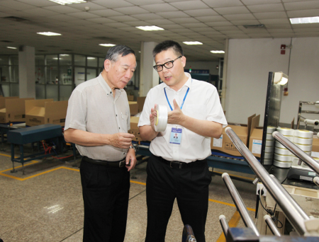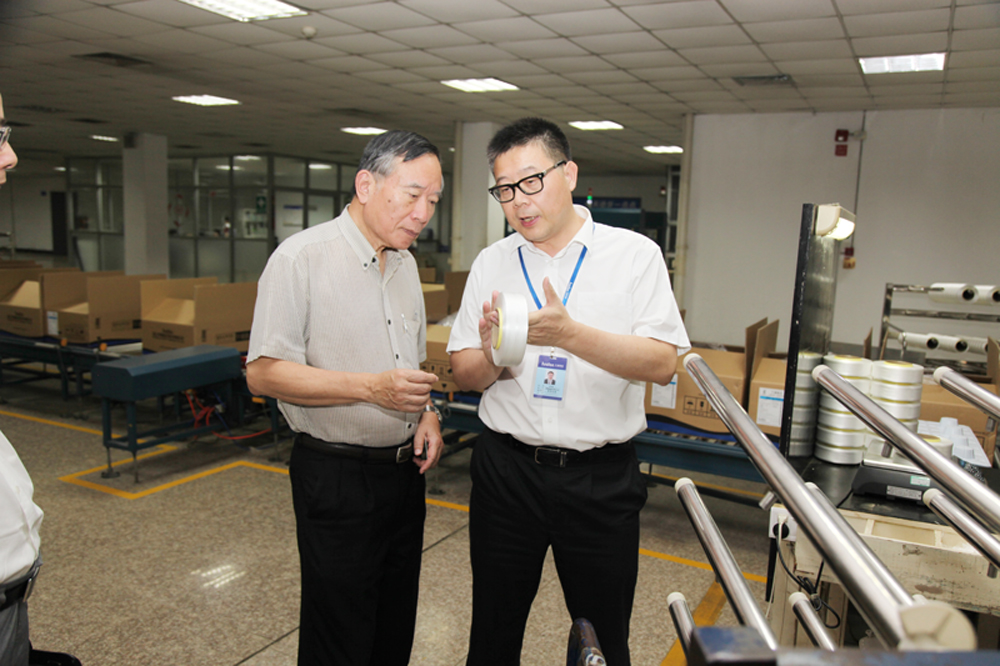 黄建南一行在集团总裁林建一、党委书记周品英的陪同下,先后参观了集团形象展厅、氨纶公司生产车间,边走边看,在听取林总裁对华峰产品、技术和企业文化建设的介绍后,黄建南连连点头表示赞许。