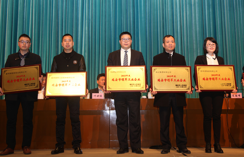 为鼓励先进,树立典型,瑞安市委、市政府在3月25日召开的全市经济工作会议上,授予华峰集团2015年度瑞安市领军工业企业。