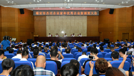 会上,市委副书记、市长麻胜聪宣读了表彰文件。会议表彰了5名2016年度瑞安市杰出企业家,19名2016年度瑞安市优秀企业家。