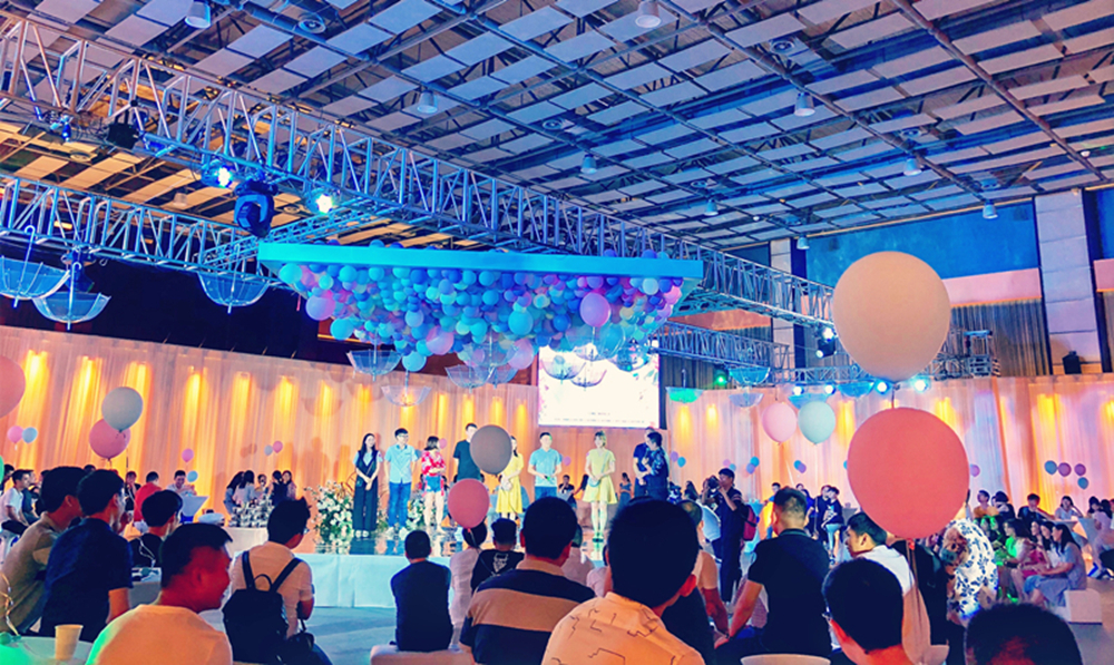 当天晚上7点,活动现场已经热闹非凡。五色的气球、绚丽的灯光、精美的饰件将现场布置得温馨高雅,宛若礼堂一般。“主场作战”的华峰青年们当然不会错过在自家门口的好机会,在脱单墙前,认真寻找着适合自己的心仪对象。