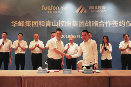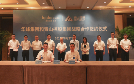 华峰集团董事局主席尤小平与青山实业集团董事局主席项光达在签约仪式上先后致辞,华峰集团董事长尤飞宇与青山控股集团董事长项秉雪分别在战略合作协议上签字,两企业相关领导出席了本次签约仪式。