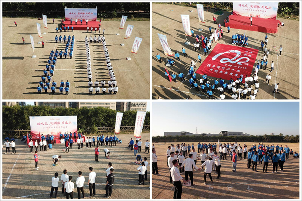 在主持人的指挥下,参赛者们举起印有“华峰氨纶20周年,携手同行二十年,开创未来大发展”的祝福语牌,有序地切换着不同的队形,依次举牌摆出“ZG”、“70”、“HF”和“20”四个字母图案,形象地表达了“庆祝祖国成立70周年,华峰氨纶成立20周年”的美好寓意。