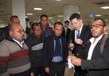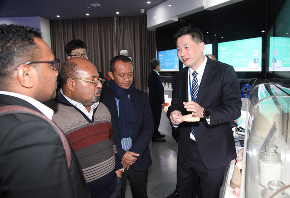 巴利主席一行先后参观了集团形象展厅和氨纶生产车间。参观过程中,巴利主席对华峰在产业创新驱动上的巨大投入,对华峰产品的高科技含量与高附加值表示认可。在认真听取华峰十大系列产品的介绍后,巴利主席在一旁打趣道:“这么多产品每个都很好,希望以后都能够带到印尼去生产。”在实地走访氨纶生产车间后,巴利主席一连用三个“Good”再次表达了对华峰自动化生产高水平和现代管理高水平的赞赏。