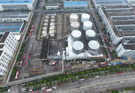 现场模拟溶剂罐区乙二醇储罐输液管发生泄漏,后因应处置和技术人员关阀处置不当引发起火。公司第一时间成立应急指挥部启动应急预案,疏散现场人员,集合义务消防队至事故区域利用单位内部消防设施进行自救,但无法控制火势蔓延扩大,现场火势沿管道回火至储液罐,导致乙二醇储罐发生火灾,随后公司向瑞安应急联动中心报警,请求社会力量支援,很快120、110、122、119四方联动开展救援工作,演练过程中应急队伍行动迅速、配合有序、处置得当,演练取得圆满成功。