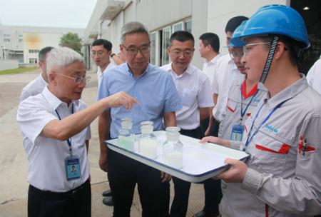 在尼龙66生产车间,三种技术迭代优化的尼龙66产品引起了种及灵的兴趣。尤小平在一旁汇报了重庆华峰“十四五”期间重点建设尼龙66一体化项目,描绘了打造“中国尼龙城”的长远蓝图和未来规划。