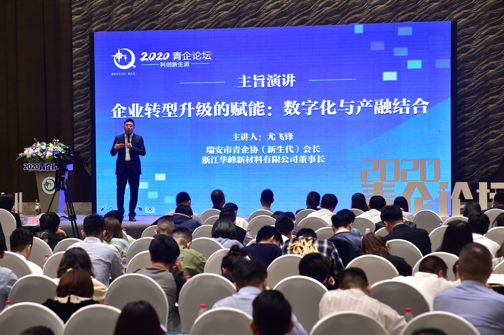 当天下午,新任会长尤飞锋还在瑞安市青企协(新生代)举办的2020“科创新生派”青企论坛上,做了《企业转型升级的赋能:数字化与产融结合》主旨演讲,为企业创新变革、转型升级带来新思考。