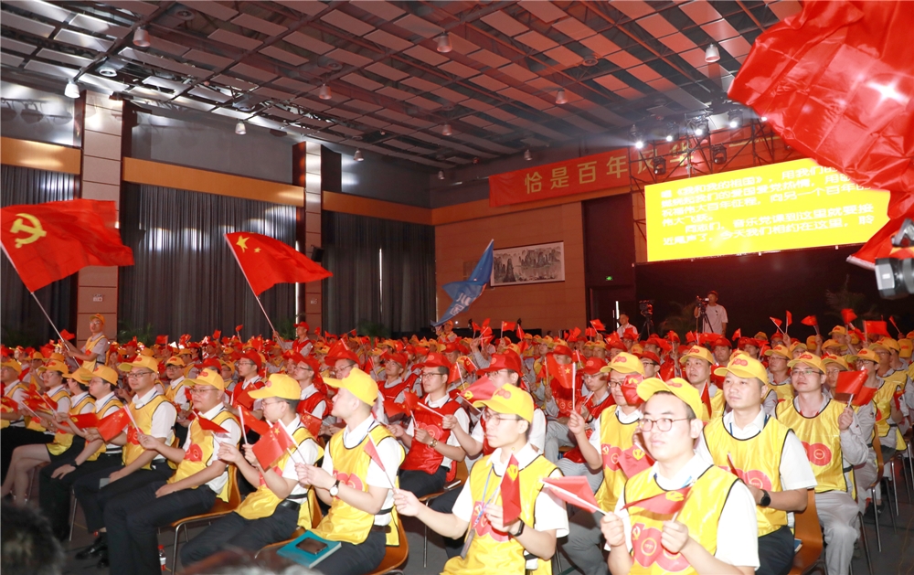 全场党员用力挥舞着党旗和国旗,用满怀爱党爱国情愫的歌声,述说着对党百年华诞的祝福。