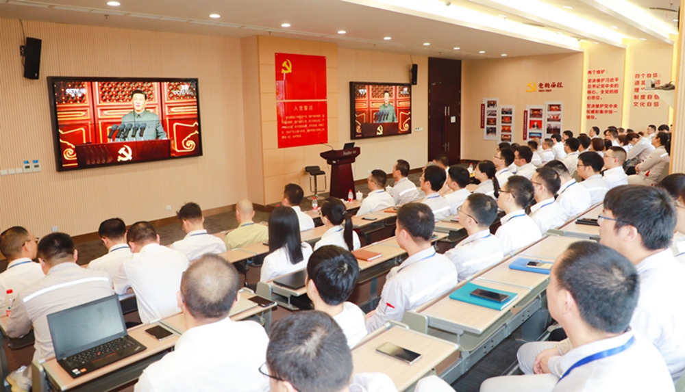 是日上午8时,集团党委组织90多名党务干部、党员代表,共同守候在银幕前观看庆祝中国共产党成立100周年大会实况直播,认真聆听习近平总书记的重要讲话,共庆中国共产党百年华诞。