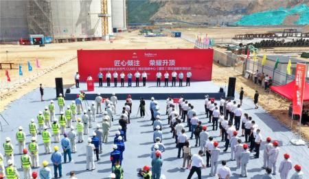 “现在我宣布,温州华港LNG项目升顶成功。”9月16日上午10时08分,在温州华港液化天然气(LNG)储运调峰中心项目的2号罐现场,随着中国寰球工程有限公司党委书记魏亚斌的一声报告,直径82米、重达675吨的储罐拱顶在3台鼓风机“鼓气”作用下缓缓升起,经过37.5米的平稳上升,拱顶精确地与罐顶承压环完美契合,气升顶工作顺利完成,全程历时188分钟。