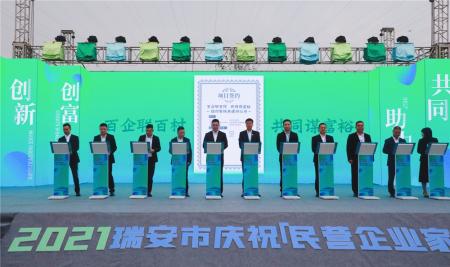 10月28日下午,2021瑞安市庆祝“民营企业家节”大会在中塘河河畔举行。我市民营企业家、行业协会商会代表与各级党政领导齐聚一堂,共同庆祝温州第三个民营企业家节。华峰集团总裁林建一,副总裁尤飞锋作为企业家代表出席会议。