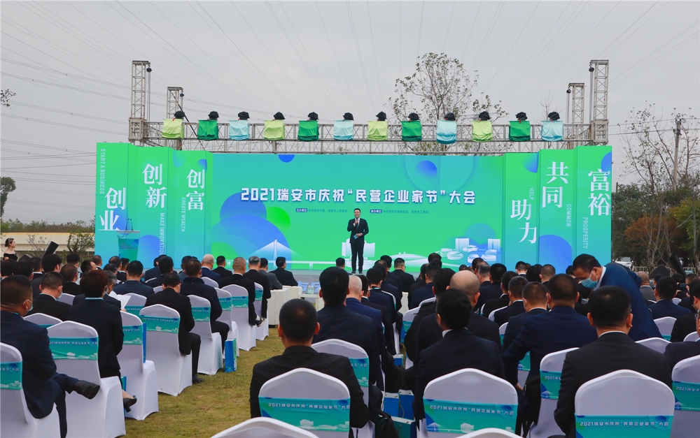 大会最后,瑞安市委书记麻胜聪在讲话中指出,民营企业是瑞安发展的金字招牌,民营企业家是瑞安人精神的重要传承者。希望广大民营企业家坚守实业创大业、坚持创新强主业、坚定理想助伟业,争做实干瑞商、奋进瑞商、担当瑞商,在瑞安高水平打造“青春都市、幸福瑞安”,争当高质量发展建设共同富裕示范区先行标兵的新征程上彰显担当、展现作为。(李其中)