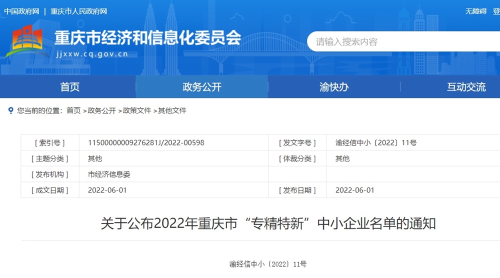 据了解,本次“专精特新”企业评选是重庆市经信委贯彻落实《重庆市人民政府办公厅关于印发重庆市推进“专精特新”企业高质量发展专项行动计划》,旨在培育壮大一批专注细分市场、创新能力强、质量效益高、产业支撑作用大的“专精特新”中小企业,引领带动中小企业高质量发展。
