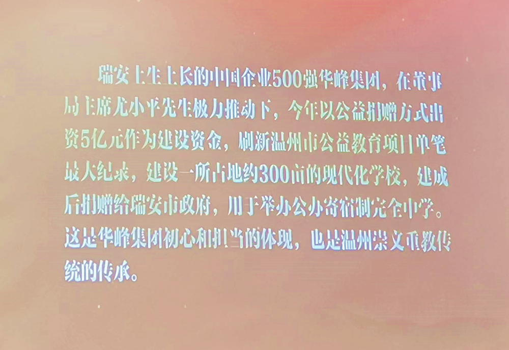 正如大会上获奖介绍所言:瑞安土生土长的中国企业500强华峰集团,在董事局主席尤小平先生极力推动下,今年以公益捐赠方式出资5亿元作为建设资金,刷新温州市公益教育项目单笔最大纪录,建设一所占地约300亩的现代化学校,建成后捐赠给瑞安市政府,用于举办公办寄宿制完全中学。这是华峰集团初心和担当的体现,也是温州崇文重教传统的传承。