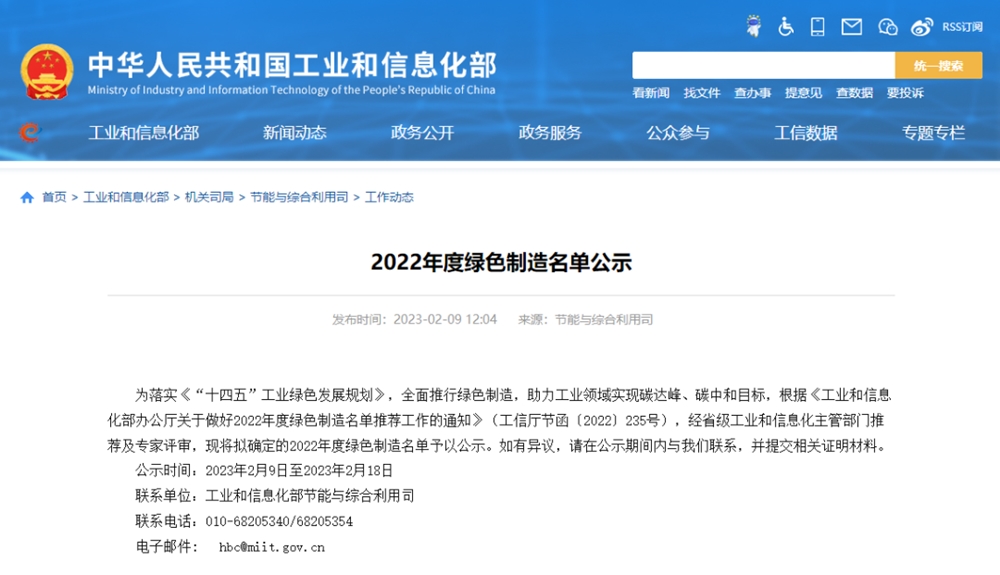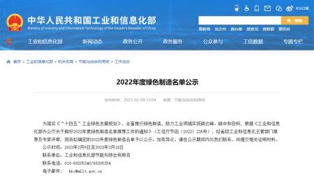 据了解,“绿色工厂”是指实现用地集约化、原料无害化、生产洁净化、废物资源化、能源低碳化等特点的制造工厂。国家级“绿色工厂”评选由国家工业和信息化部组织开展,经申报单位自我评价、第三方机构评价、省级工业和信息主管部门评估及专家论证、公示等环节最终确定。据悉,此次公示时间为2023年2月9日至18日,旨在落实《“十四五”工业绿色发展规划》,全面推行绿色制造,助力工业领域实现碳达峰、碳中和目标。