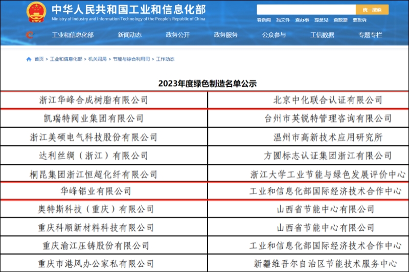 11月8日,从工业和信息化部发布的《2023年度绿色制造公示名单》获悉,浙江华峰合成树脂有限公司和华峰铝业有限公司双双获评“国家级绿色工厂”。至此,华峰集团旗下获评“国家级绿色工厂”总数已达7家,这将进一步激发企业始终秉承绿色发展理念,走可持续发展之路的内生动力。