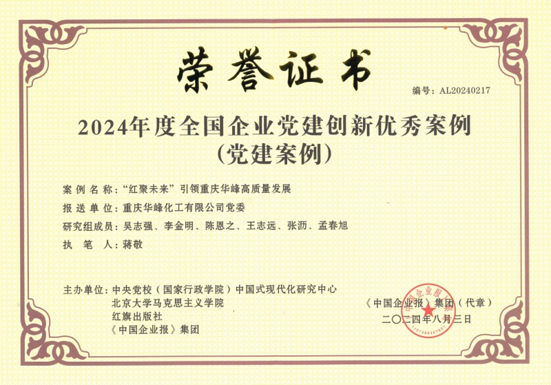 日前,由中央党校中国式现代化研究中心等单位主办的2024全国企业党建(案例)研讨会暨第四届企业党建创新优秀案例发布仪式在北京举办。会议隆重举行了2024年度全国企业党建创新优秀案例发布仪式,重庆华峰党委“‘红聚未来’引领重庆华峰高质量发展”的党建案例成功入围。