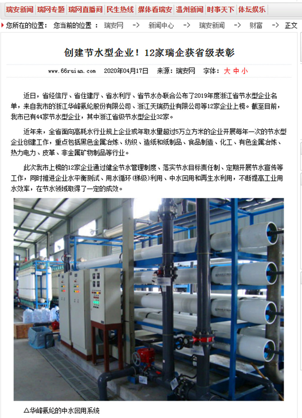 近日,省经信厅、省住建厅、省水利厅、省节水办联合公布了2019年度浙江省节水型企业名单,来自我市的浙江华峰氨纶股份有限公司、浙江天瑞药业有限公司等12家企业上榜。截至目前,我市已有44家节水型企业,其中浙江省级节水型企业32家。
