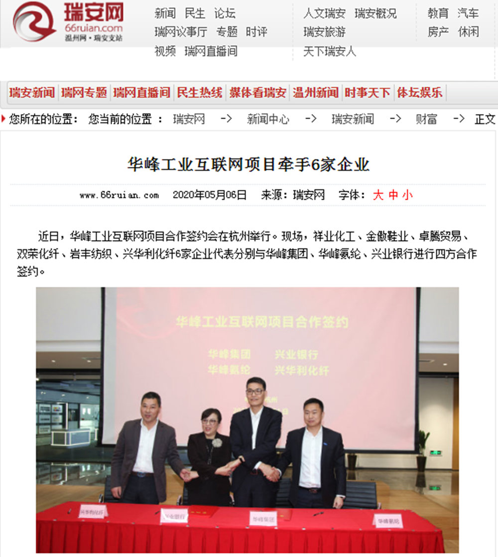 近日,华峰工业互联网项目合作签约会在杭州举行。现场,祥业化工、金傲鞋业、卓腾贸易、双荣化纤、岩丰纺织、兴华利化纤6家企业代表分别与华峰集团、华峰氨纶、兴业银行进行四方合作签约。