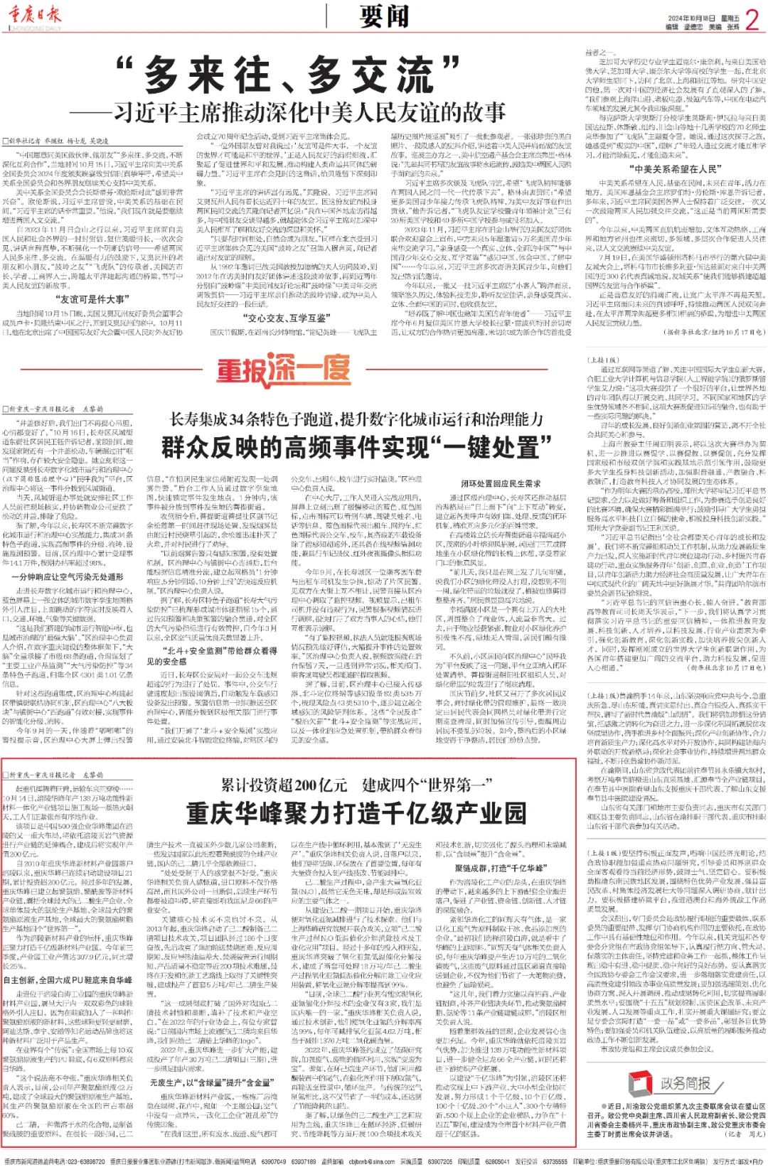 日,重庆市委书记袁家军调研重庆华峰新材料产业园。第二天,《重庆日报》推出专题报道“重庆华峰聚力打造千亿级产业园”。