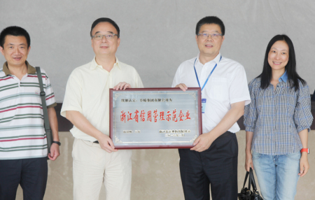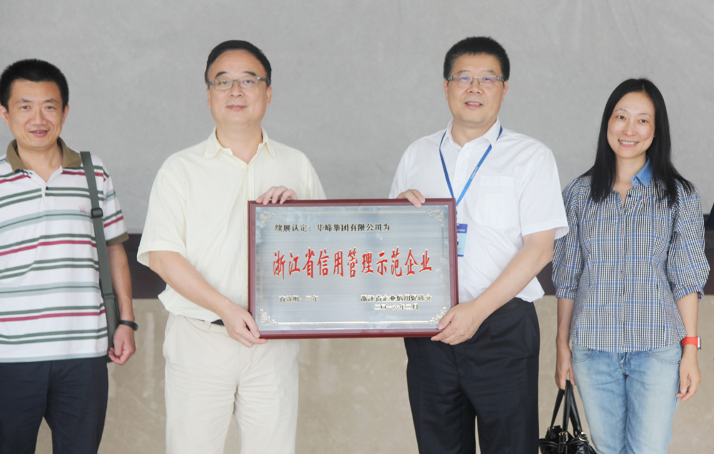 ⑥8月26日,温州市市场监管局党委书记鲍卫翔在瑞安市市场监管局局长金建中的陪同下莅临华峰,对华峰集团被评为“浙江省信用管理示范企业”进行授牌。鲍书记强调,要深入开展“诚信第一、品格第一”的诚信理念教育,引导管理干部和党员率先垂范、以身作则,进一步提升企业的诚信意识,做到对员工讲诚信、对客户守诚信、对社会扬诚信,用诚信的产品来赢得企业声誉,全面树立企业的诚信形象,打造真正值得社会信赖的华峰品牌。