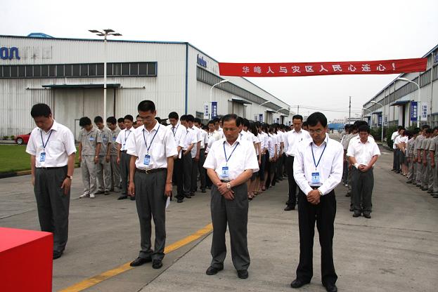 5月19日14时28分,华峰集团在莘塍厂区举行了为四川汶川大地震中遇难同胞默哀仪式。来自氨纶公司及其他子公司的100余名员工代表参加了活动。集团党委书记致哀悼词,随后全体人员面对半降的国旗,默哀三分钟,沉痛悼念在汶川地震中遇难的同胞。