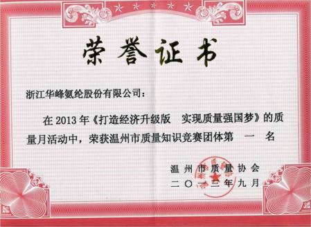 经过激烈角逐,但琴琴、戴伟丹、林丹和袁学兵组成的代表队获得了温州市质量知识竞赛团体赛冠军。在个人赛中,但琴琴、戴伟丹两位员工以优秀成绩分获温州市质量知识竞赛个人赛冠军和亚军,但琴琴还被温州市推荐参加浙江省质量知识竞赛。