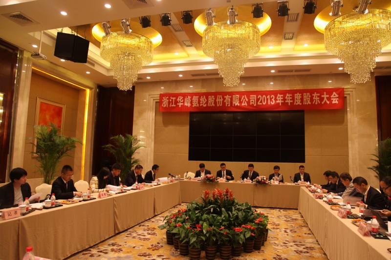 4月21日上午,华峰氨纶在瑞安国际大酒店召开了2013年年度股东大会,公司股东及股东代表共15人参加会议,独立董事端小平、公司部分监事、董事及高管列席本次会议,会议由董事长杨从登主持。会议审议并通过了2013年度董事会工作报告、监事会工作报告、财务决算报告、年度利润分配预案和续聘立信会计事务所议案等七项议案。