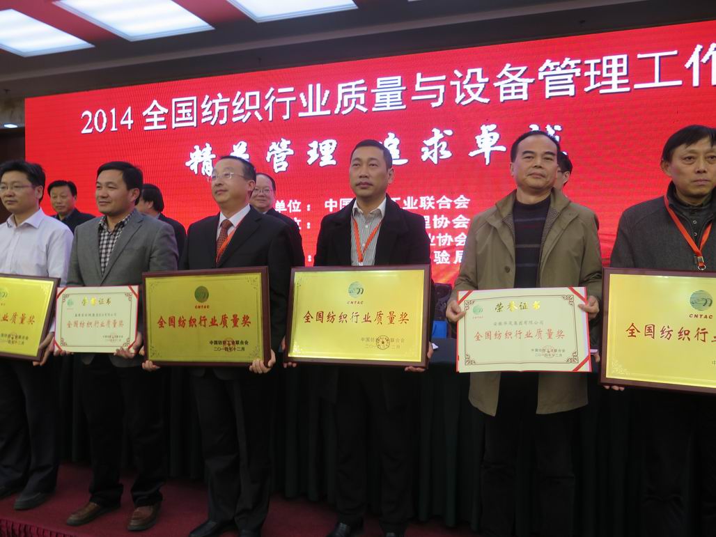 12月25日,2014年全国纺织行业质量与设备管理工作会在山东省济南市召开,来自工信部、中纺联与纺织各行业协会相关负责人及企业代表200余人参加了会议,华峰氨纶荣获第三届“全国纺织行业质量奖”。