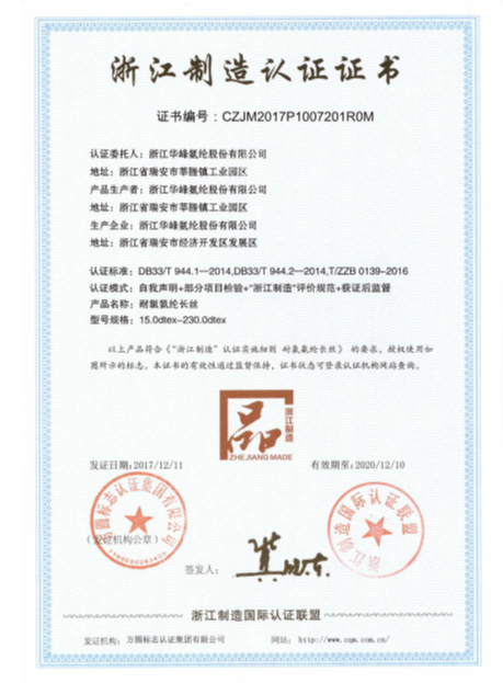 近日,华峰氨纶公司收到了由方圆标志认证集团公司和浙江制造国际认证联盟联合颁发的“浙江制造”认证证书,标志着公司耐氯氨纶长丝的各系列产品顺利通过了浙江制造业含金量最高的标准认证。