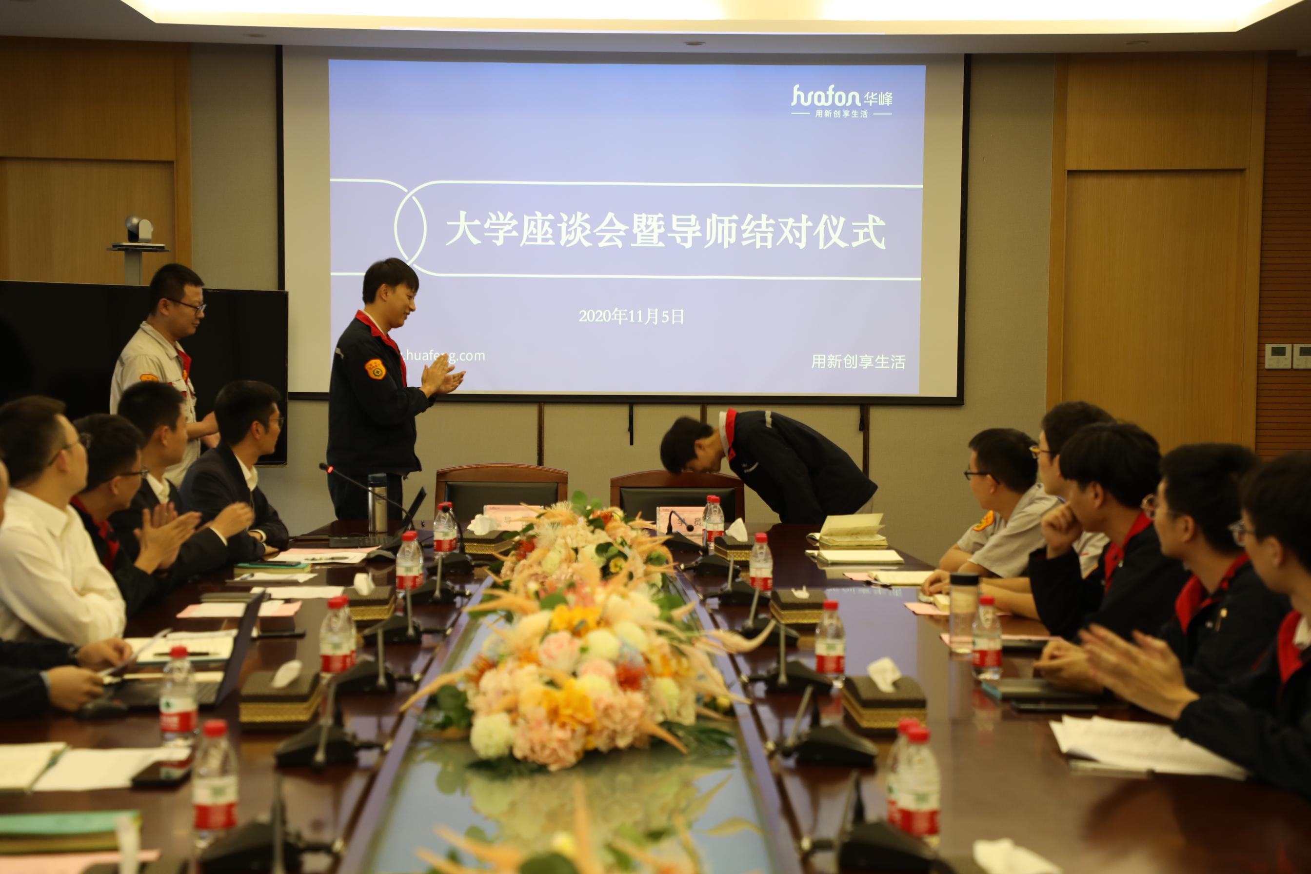 会议由导师结对和座谈会两部分组成,导师结对仪式上,主持人对各位导师做了介绍,并进行了导师学员签约仪式,签约之后,每位学员向导师行鞠躬礼,让整个仪式充满责任和仪式感。
