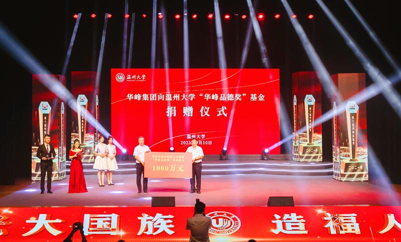 尤飞宇指出,经过10年的发展,温州大学“华峰品德奖”已经成为一个具有知名度的公益品牌,赢得了社会各界的充分肯定。为此,他还带来一个好消息:华峰集团将在原来设立的1000万元品德基金基础上,再追加1000万元,一如既往地支持温州大学的德育工作,进一步加大对道德模范的激励和褒奖。通过此次捐赠表明,在下一个十年,“华峰品德奖”将继续成为弘扬温大“厚培德本”优良传统与华峰“以德为先”人才理念、传播社会正能量的精神沃土,深入推进校企双方共同的价值追求。