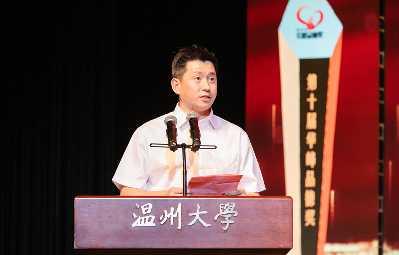 华峰集团董事长尤飞宇在致辞中有感而发,他说,十年来,“华峰品德奖”初心未改,不断发掘身边的品德榜样,用一份份信得过、学得到的品德事迹,充分展现了温大深厚的育人底蕴和温大人的优秀品格,为温大广大师生和社会各界树立了鲜活榜样,也为企业加强员工道德实践及教育最具说服力的鲜活教材。他号召大家要与道德同行,向榜样看齐,共同做文明道德风尚的传播者、践行者和引领者,用生活中的每一件善举,汇成崇德向善的时代潮流。