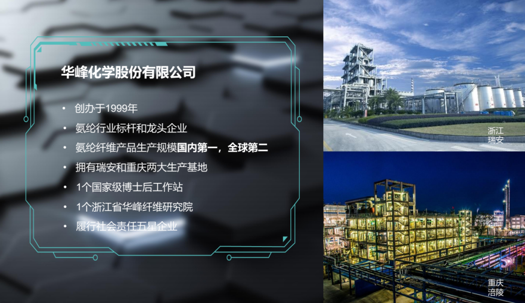 华峰化学股份有限公司在氨纶领域有着深厚的产业基础及强大的研发能力,深耕氨纶的功能性、差异化。针对高性能运动服装的需求,华峰化学纤维研究院研发工程师张经瀚重点介绍了华峰化学在高弹氨纶、酸性可染氨纶、抗菌氨纶、舒适氨纶、吸湿快干氨纶上的研发成果。千禧高弹氨纶力学性能较普通氨纶进一步提升,可赋予服装面料更优异的拉伸和弹性;千禧酸性可染氨纶酸性染料上染率高、色牢度高,且定型温度低,节能降耗;千禧抗菌氨纶在高分子中引入广谱活性抗菌成分,使氨纶乃至成品面料具有持久的抗菌效果;千禧舒适氨纶具有高伸长、低模量、高弹性回复率,能够降低运动时面料的紧绷感;千禧吸湿快干氨纶通过化学接枝改性等,可明显增加服装面料的吸湿快干性能,且具有耐水洗性能。