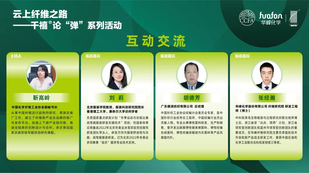 在访谈环节,本期嘉宾针对冬奥运动纺织品联合开发过程及成果、纤维端如何在产业价值链中实现业务驱动、千禧氨纶创新技术等进行了分享。