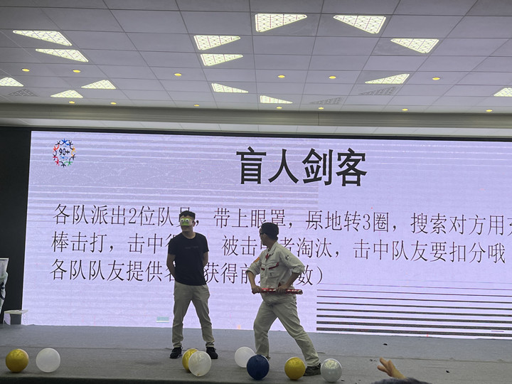 在盲人剑客环节,90+联盟成员李辉和孙程鹏在队员的指挥下,为大家带来了捧腹大笑的表演,在孙程鹏的奋力一击下,李辉突然来了个假动作,反手追击一剑,最终击败对手,A队获得最终胜利。