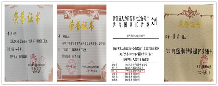 其实,在黄琪身上,爱攻难、善创新成为他的一个耀眼工匠标签。在爱打拼方面,他也是一名爱较劲的猛将,尽管他说自己“每次到了比赛场合,都会紧张,好成绩没出过”。其实,翻看他代表公司出战的比赛经历,可以说是收获满满、屡立战功。瑞安市钳工职业技能大赛三等奖、温州市钳工职业技能大赛三等奖和二等奖,一个个钳工比拼成果的背后,是他精益求精、独具匠心的最好写照;他也因为出色的工作成效,先后获得温州市“青年岗位能手”和“浙江青年工匠”称号。