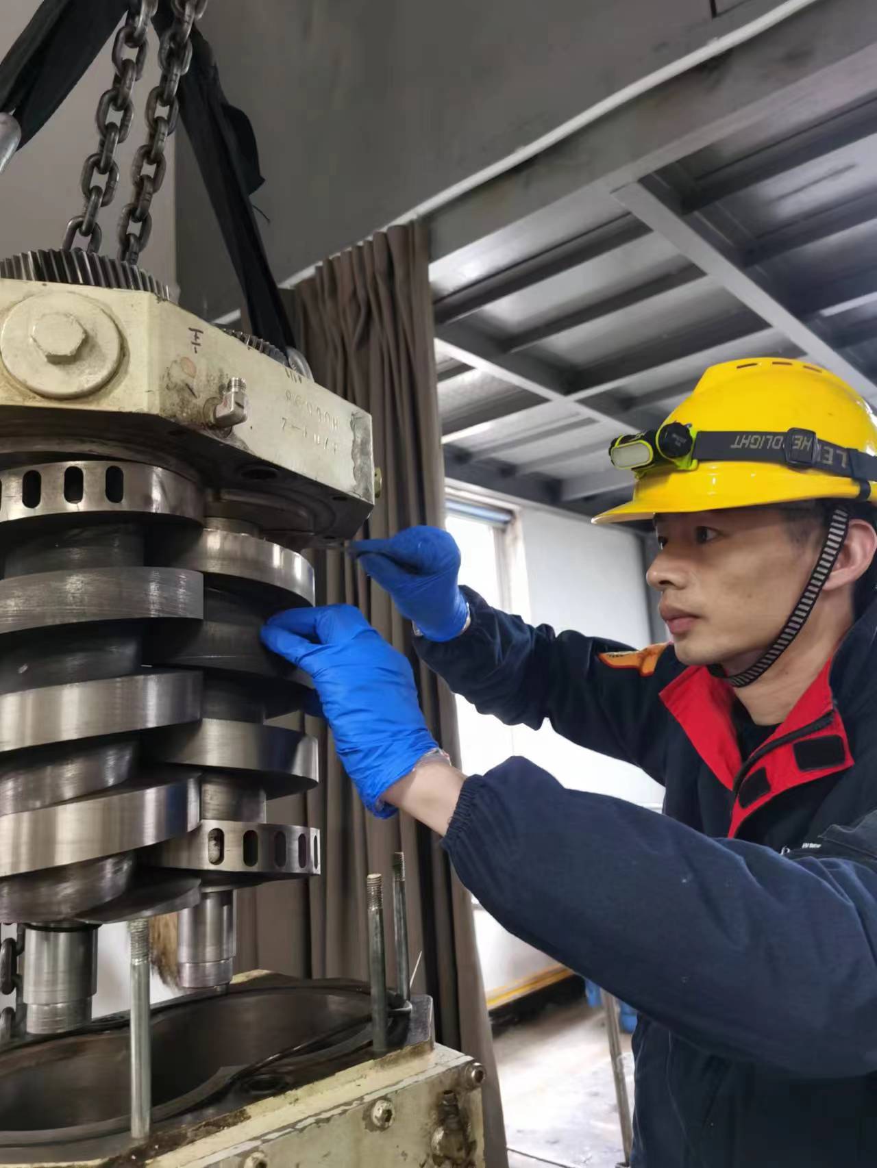 经过短期的培训和持续的实践,机修工黄琪已经成为了公司真空干泵维修的“名师”。跟踪采访黄琪维修真空干泵的过程,发现拆、修、装、调一整套流程要两个人持续奋战两天才能完成,真是“没有金刚钻,不敢揽瓷器活”。那是今年3月中旬的一个上午,开完早会,黄琪开始了新一轮与设备打交道的巡检。SM风机、纺丝槽泵、真空干泵、热水泵、组件齿轮泵等等,听诊棒挨个一触一碰一听,一切正常,设备无异,看来今天会是一帆风顺的一天。然而,黄琪匀速前进的脚步被打乱了,他停住了,对真空泵设备进行触诊有异常,一次不够再来一次,似乎他已经预判了什么。当黄琪走完一轮巡视路线后,他重新折返观察,又进行了一次侧耳倾听,多次的“听诊”,他已经确定运行的真空泵有细微的杂音,预判是电机轴承处有异常。根据经验,真空泵出毛病,一般是先杂音异常,再产生震动,最后发展至卡死罢工;一台真空泵直接关联纺丝6条线的生产,如若突然卡死,那更换起来肯定会耽误事。