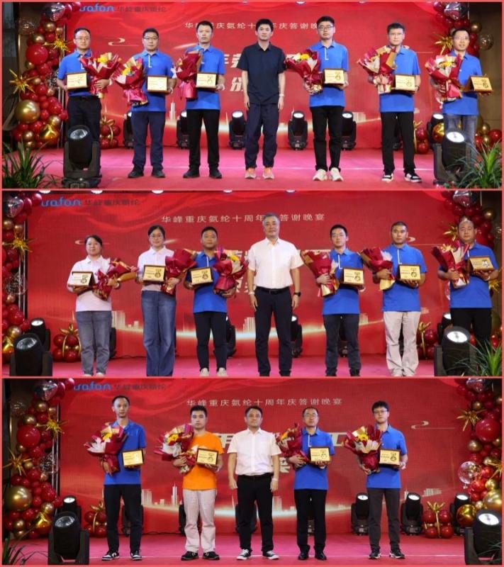 “他们是公司发展道路上的见证者和奋斗者。他们无私奉献、团结协作,在过去的十年中,他们秉持着对工作的热爱和责任感,为公司的稳定发展做出了突出贡献……”晚宴期间,华峰重庆氨纶公司还特别表彰了16位荣耀员工,与会领导向他们颁发了荣誉奖杯,并向他们表达了最真挚的感谢和敬意。