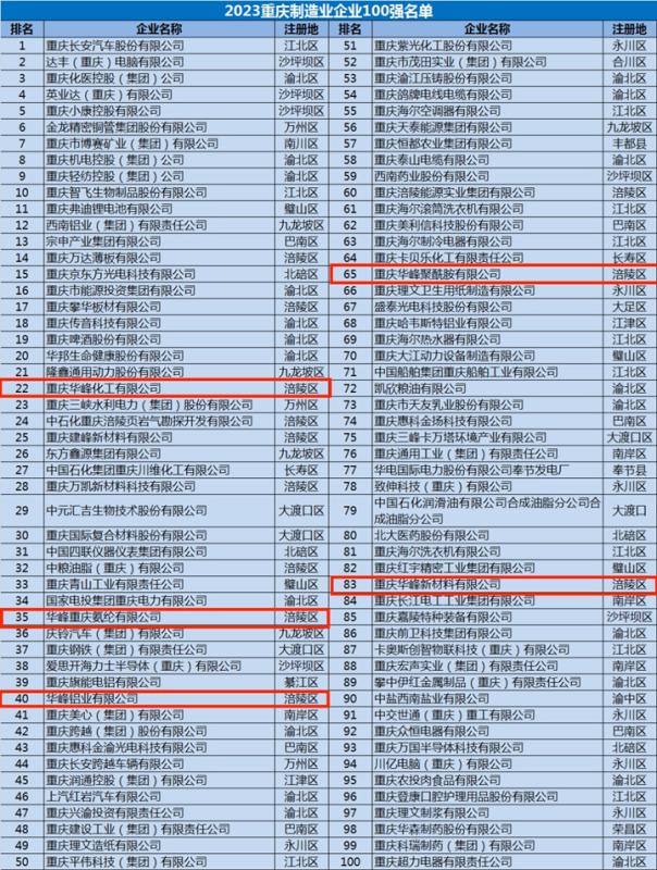 近日,由重庆市企业联合会(企业家协会)主办的2023重庆企业100强和2023重庆制造业企业100强榜单重磅发布。重庆华峰化工、华峰重庆氨纶、华峰铝业三家公司分别位列2023重庆企业100强的第44、72和82位,其中,华峰铝业为首次入围市级百强企业榜单。此外,三家公司还分别位列重庆制造业企业100强榜单的第22、35和40位,重庆聚酰胺和重庆新材料则分列65位和83位。