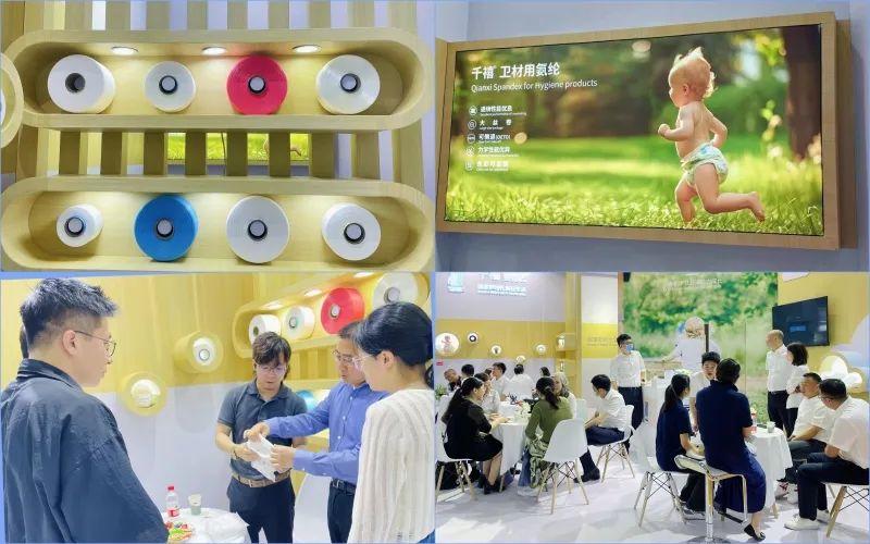 本次展会,华峰化学携旗下千禧?卫材用氨纶产品精彩亮相,展出了多种规格、多种色彩的差异化氨纶及纸尿裤产品。作为一种可替代传统橡胶制松紧线的弹性材料,千禧?卫材用氨纶产品弹性和退绕性能优异,达到国际先进水平,可以广泛应用在纸尿裤、拉拉裤、经期裤和纸尿片等卫生用品中。同时,该产品大丝卷包装,根据客户需求,可对色彩和规格进行定制,深受当天前来洽谈的纸尿裤生产厂商亲睐。