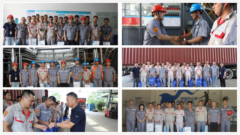 首先,总经理朱炫相带队,与工会主席李娟及制造部经理叶国建一同抵达化学公司组件E车间。组件现场,操作员们停下忙碌的工作,额头的汗珠仍旧不时地掉落。朱炫相总经理与组件员工一一握手,送上公司慰问品的同时,并向员工们亲切地问好。朱总表示,大家要注意身体,公司十分关心大家高温下的劳动,一定会将员工关怀落实到实处。随后,朱总一行还慰问了动力供热车间。在化学仓储现场,营销总监蔡以勇和工会副主席吴海峰,对每一个户外装车点进行慰问,为高温下忙碌的一线员工,送上一份份清凉的夏季慰问品和最贴心的问候。