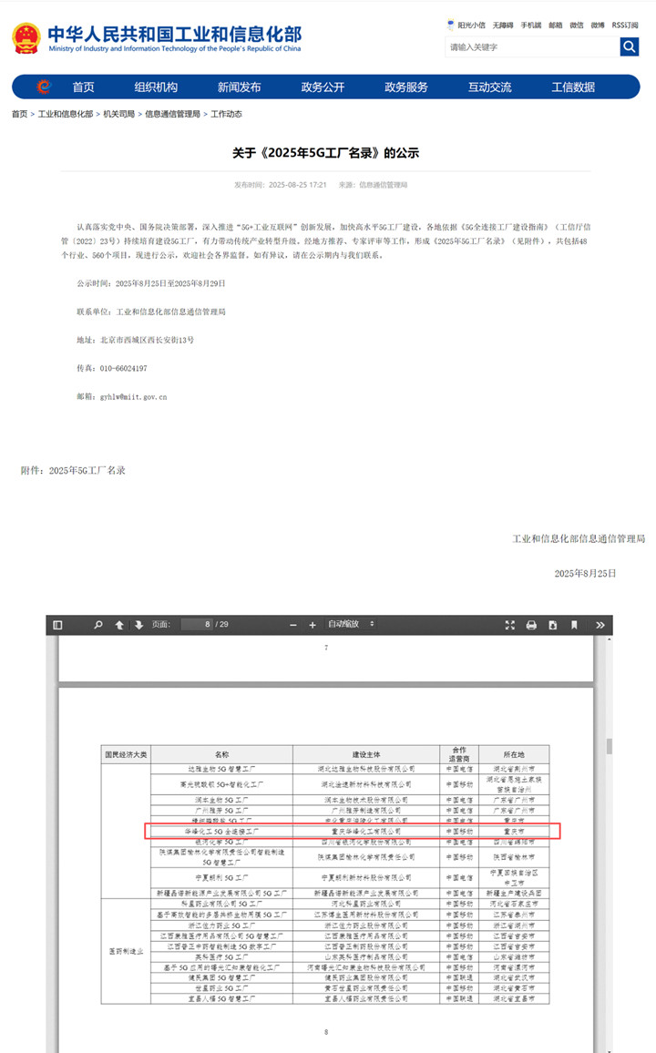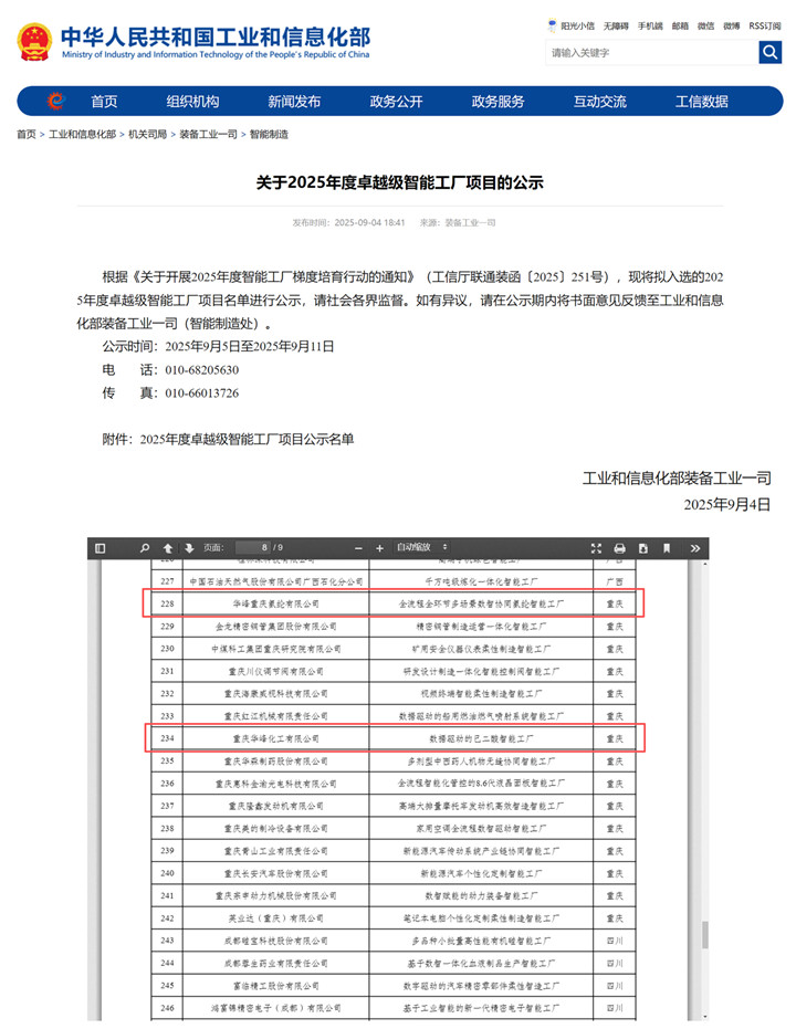 名单可见,重庆华峰化工“数据驱动的己二酸智能工厂”和华峰重庆氨纶“全流程全环节多场景数智协同氨纶智能工厂”成功上榜“卓越级智能工厂”公示名单;重庆华峰化工“5G全连接工厂项目”双料入围“2025年5G工厂”名录。