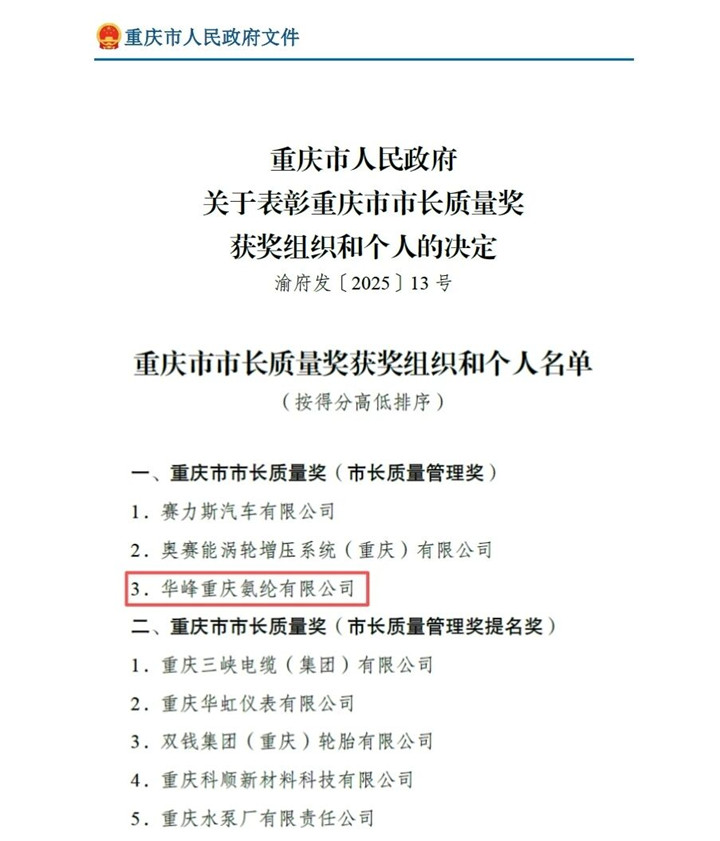 近日,2025年重庆市市长质量奖获奖名单公布,华峰重庆氨纶有限公司凭借在质量管理模式建设、创新实践及社会价值创造等方面的突出表现,荣获重庆市市长质量管理奖,成为重庆市涪陵区首家获此殊荣的企业。
