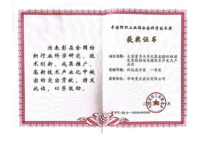 11月28日,2025年度中国纺织工业联合会科学技术奖励大会在北京人民大会堂隆重举行,对推动纺织行业科技进步的优秀成果进行表彰。由华峰重庆氨纶有限公司、华峰化学股份有限公司联合东华大学、西南大学共同研发的“大容量多孔高速氨纶智能制造关键技术开发及产业化”项目(以下简称“项目”),凭借在氨纶生产全链条的突破性创新,荣获科技进步奖一等奖,成为引领氨纶行业向绿色化、智能化转型的标杆成果。
