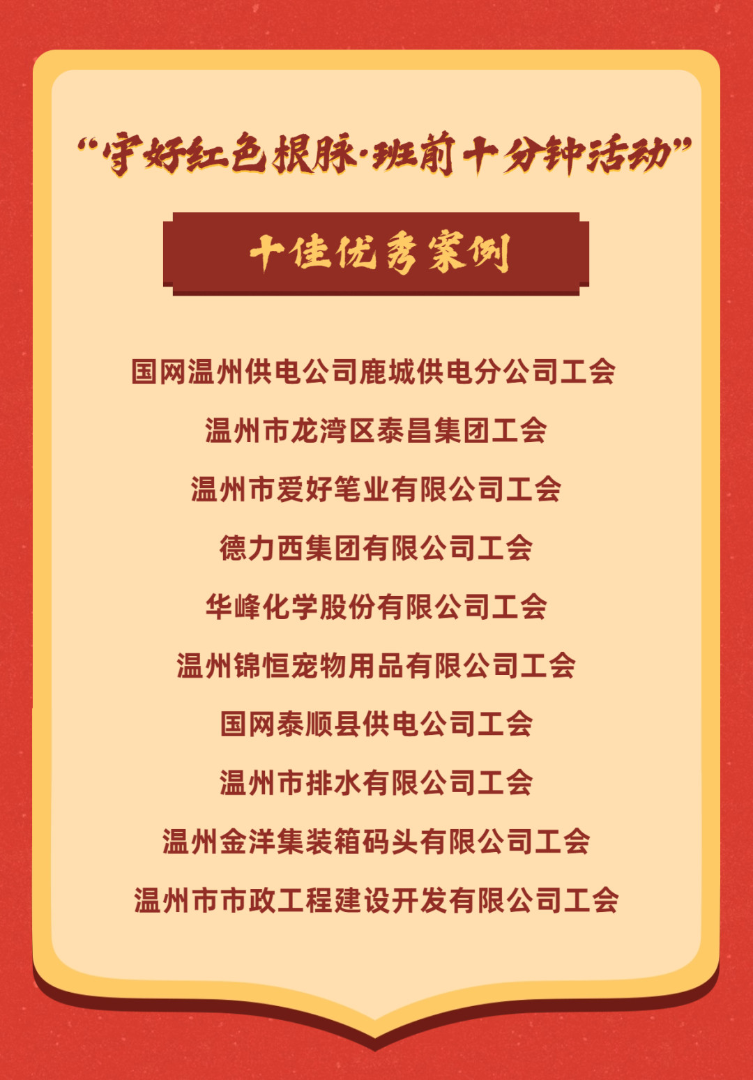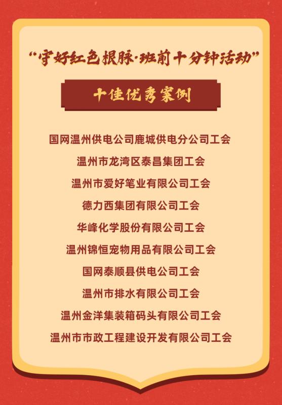 近年来,温州市总工会立足“守好红色根脉·班前十分钟活动”,不断创新企业职工思想政治工作方式方法,探索建立具有温州辨识度的一线职工思想政治教育模式,充分发挥红色宣讲团和领讲员作用,持续在市、县两级产改企业和优秀企业常态化开展“守好红色根脉·班前十分钟活动”,让红色精神不断在一线职工中走深走实,形成传承风尚。截至第二季度,今年共有包括产改试点企业的1238家企业,开展了8862场“班前十分钟活动”,105617人次参与活动,实现产改试点企业100%全覆盖,为温州打造高质量发展建设共同富裕示范市域样板、争创社会主义现代化先行市,贡献职工力量。
